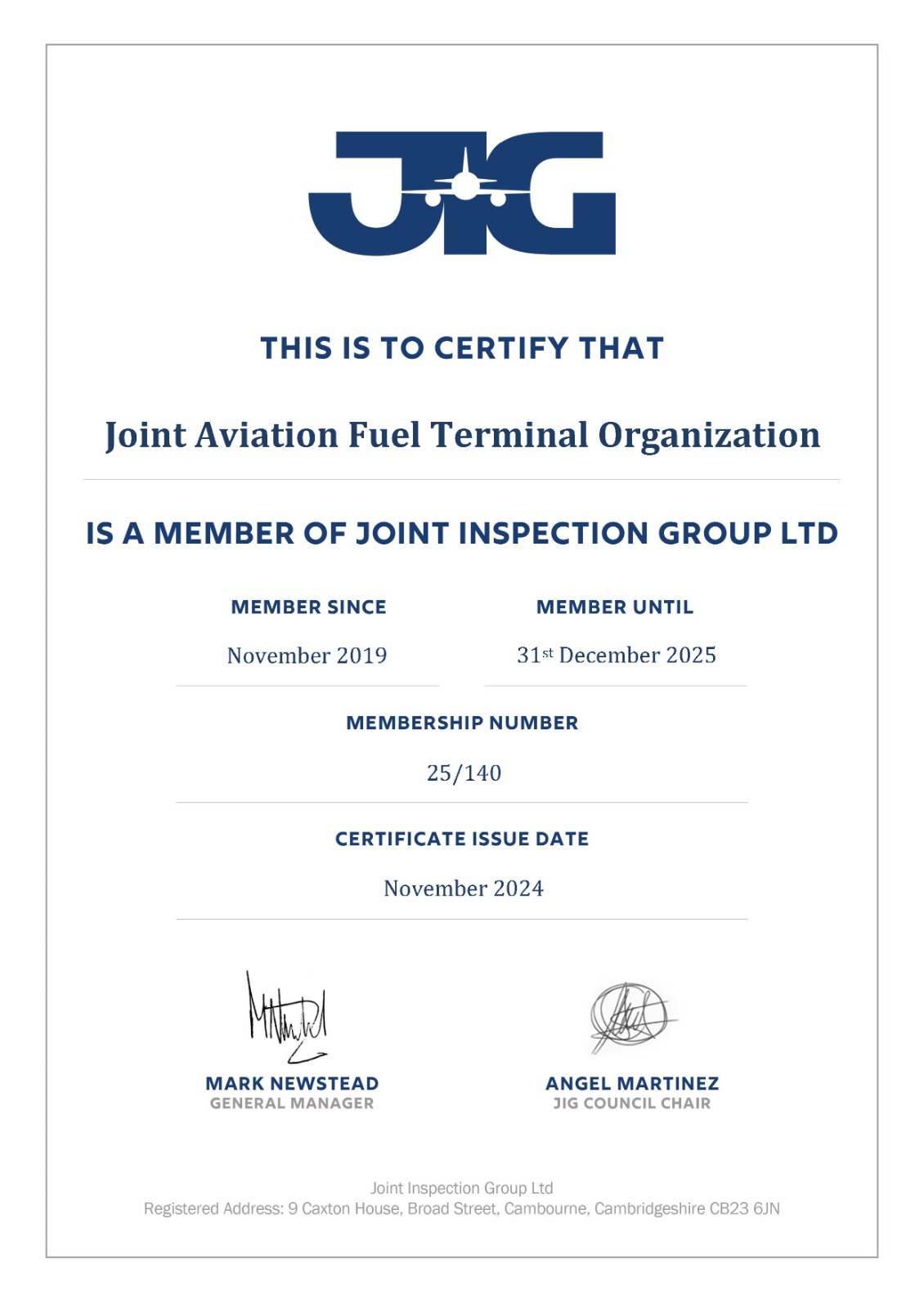 في عام 2019 أصبحت منظمة جافتو لمحطة وقود الطيران عضواً منتسباً في المنظمة الدولية Joint Inspection Group (JIG).
